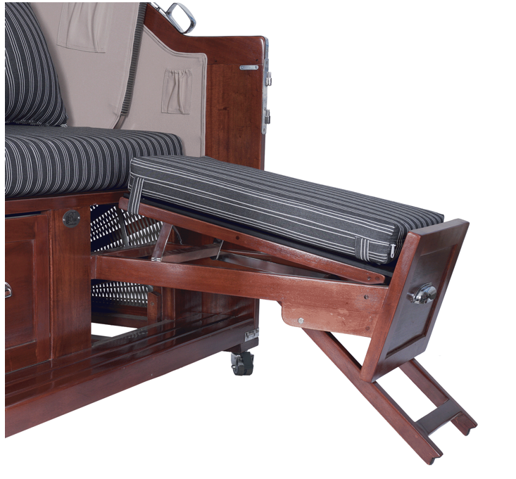 Unsere Strandkörbe werden Sie aber nicht nur des Aussehens und der Bequemlichkeit wegen lieben, sie bieten auch eine Menge Komfort. Integriert ist zum Beispiel die Fußablage, die mit einem Handgriff herausgezogen werden kann. Ein weiterer Handgriff passt die Fußablage an das Sitzniveau an, was herkömmliche Strandkörbe in der Regel nicht bieten. Eine ausklappbare Markise schützt vor der Sonne und die integrierten Tische rechts und links bieten Platz zum Essen, Trinken und dienen als Ablage.